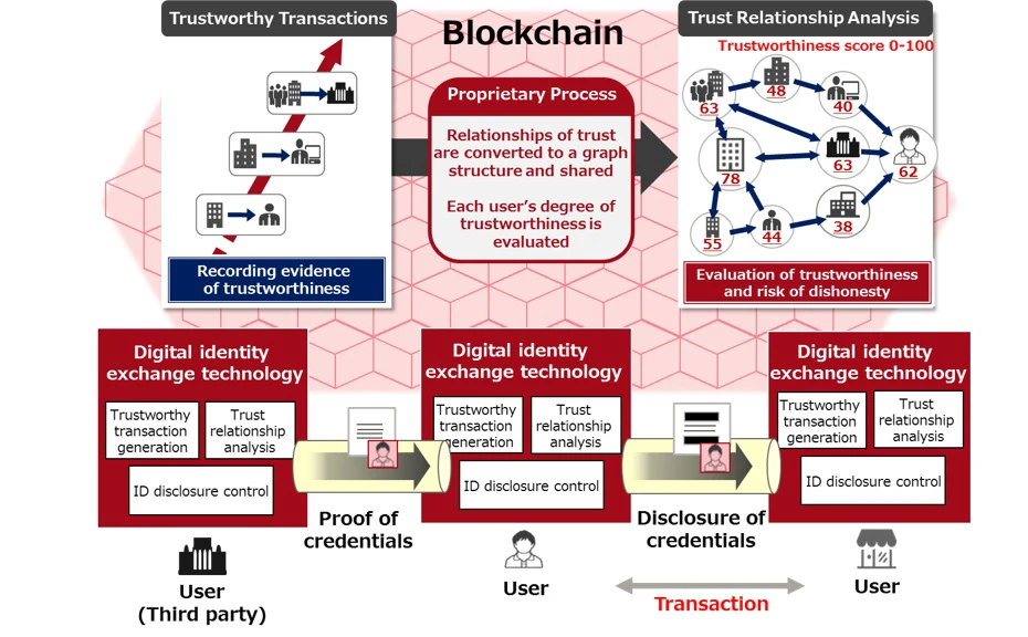 Expanding on its past use of blockchain technology, Fujitsu Laboratories has developed a new digital identity exchange technology for safely circulating personal credentials in a form that enables users to confirm the trustworthiness of the other party, drawing on factors including the status of previous transactions and evaluations by users who had engaged in transactions with the party in question, as part of a decentralized identification system.