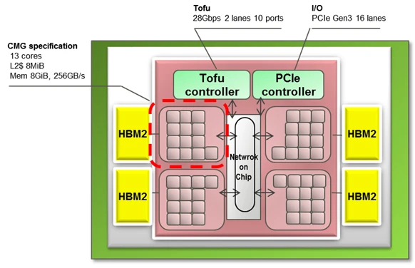 Fujitsu developed the microarchitecture of the A64FX by building on the technology of its previous supercomputers, mainframes, and UNIX servers. With hardware technology that draws out the high memory bandwidth of high performance stacked memory, the system can efficiently utilize the CPU’s high functional computational processing units, enabling delivery of high application execution performance. The CPUs will be directly connected by the proprietary Tofu interconnect developed for the K computer, improving parallel performance. The system can provide a peak double precision (64 bit) floating point operations performance of over 2.7 TFLOPS, with a computational throughput twice that amount for single precision (32 bit), and four times that amount for half precision (16 bit). In other words, by using single precision or half precision operations, applications can get results even faster. Fujitsu has also enhanced computational performance for 16 bit and 8 bit integer operations. Accordingly, this CPU is suited for a wide range of fields such as big data and AI, not just for the computer simulations at which traditional supercomputers excel.