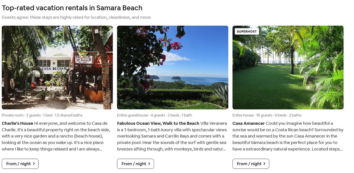 There is a daily direct bus to Sámara from San Jose takes about 4.5 hours and is 4000 Colones (US$8.00). Interbus runs shuttles (minivans) from San Jose to Sámara for US$45.00.