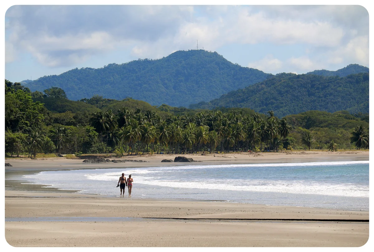 Sámara is located in a wide, picturesque bay. A coral reef protects it from the strong waves that you have in nearby Santa Teresa or Nosara, making Sámara a perfect place to enjoy the ocean, but still attract surfers, especially beginners. Even though there are quite a few hotels and guesthouses along the beach, they are well hidden by the coconut palm trees so that it retains the feel of a long stretch of undiscovered beach.