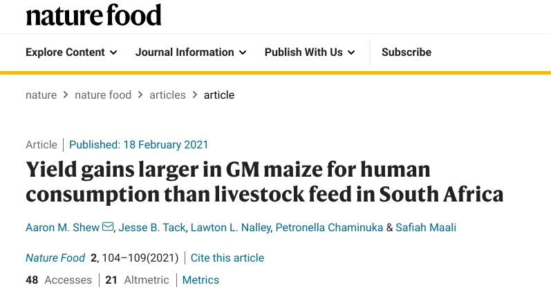 The study, published in the journal Nature Food, found that GM maize improved yields by 8 percent on average while GM white maize yield gains were more than double GM yellow maize gains.