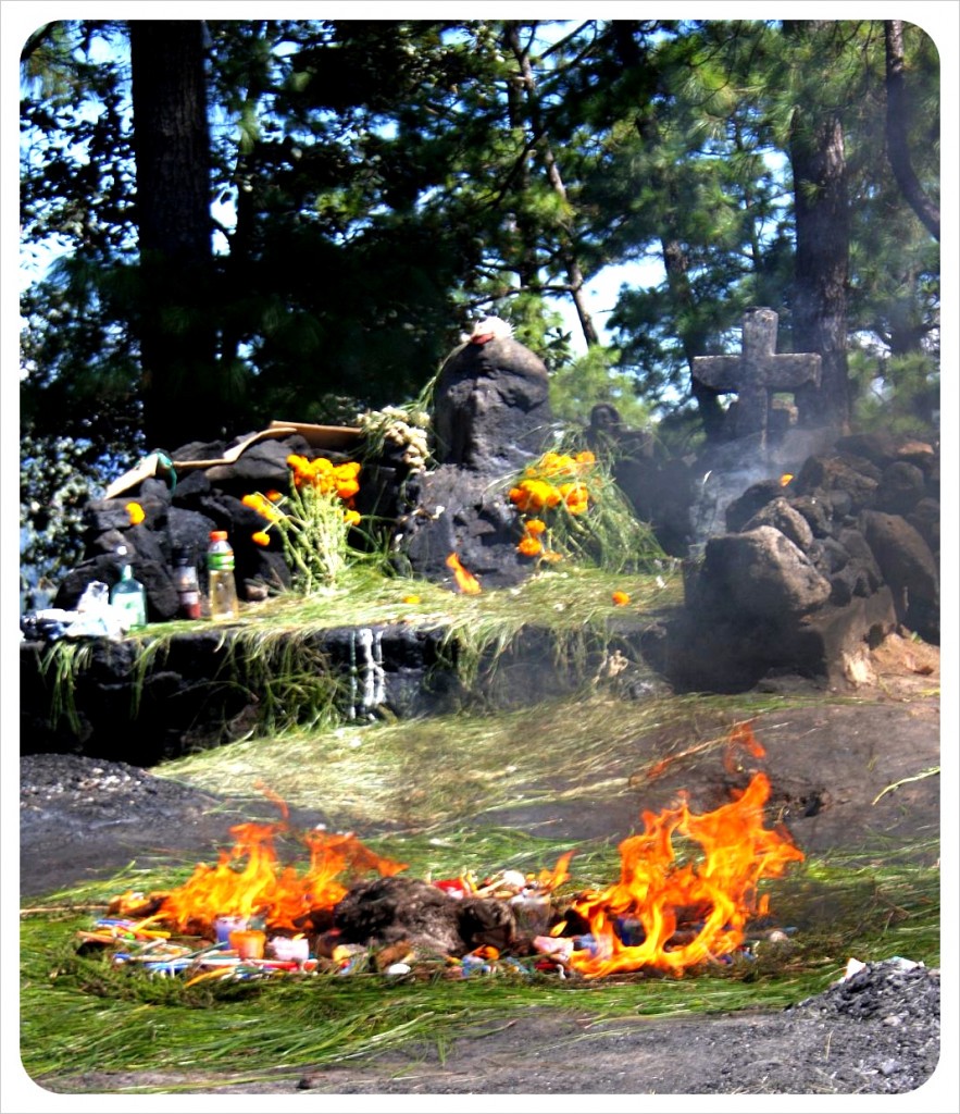 On a hike through the hills outside of town during our visit, we walked upon a private ceremony of a traditional rooster sacrifice taking place to the Maya sacrifice stone, Pascual Abaj, a shrine to the Maya Earth God Huyup Tak’ah. Made of a large black rock surrounded by stones, the shrine is said to be thousands of years old. Here the Mayans hold sacrificial rituals to pray for health, good fortune, and women can ask for a ritual to find a sober and good husband.