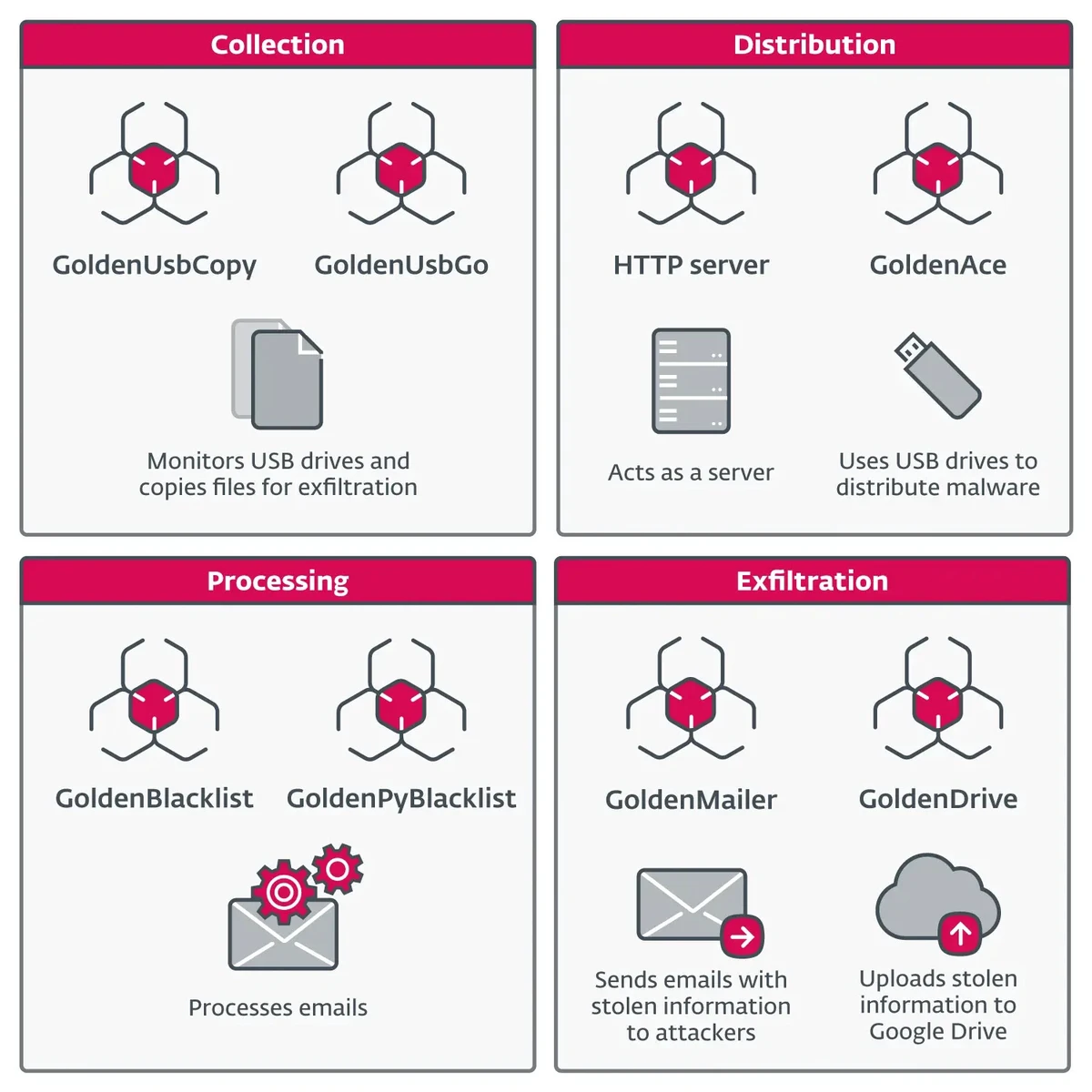 The group employs a sophisticated toolset that includes malware like “GoldenDealer,” “GoldenHowl,” and “GoldenRobo.”