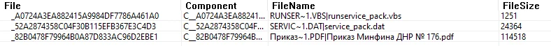 Essentially, the MSI file is a dropper package that contains a decoy document that is supposed to display to the victim, combined with an encrypted next-stage payload (service_pack.dat), a dropper script (runservice_pack.vbs), and the payload itself.