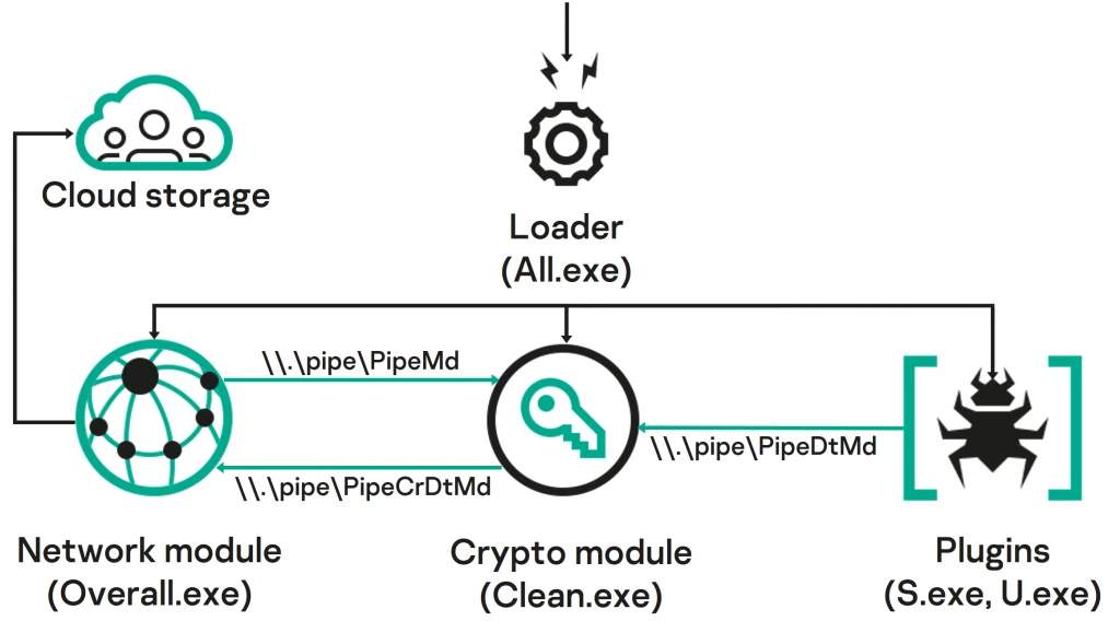 Several executable modules are part of the CommonMagic framework, all located in the directory C:\ProgramData\CommonCommand. Each module runs as a standalone executable file and communicates with each other through named pipes.