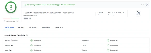 As a result, Redigo is a new Redis backdoor malware it remains undetected in Virus Total by all vendors during the investigation.