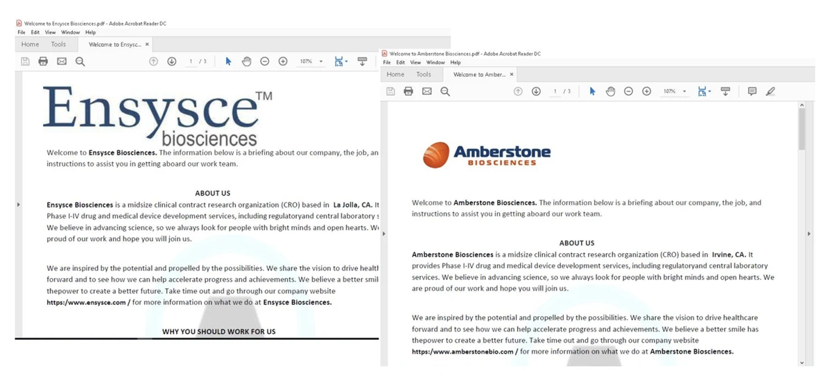 The spoofed PDFs contained the same text content overall, with some details changed, including the brand logo, company name, website, and location.