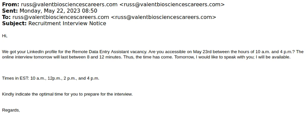 Initially, the threat actor sent an email with the subject line of re: interview, interview invite, and an invitation to interview (FRND), offering an interview call with the attachment of the offer letter.