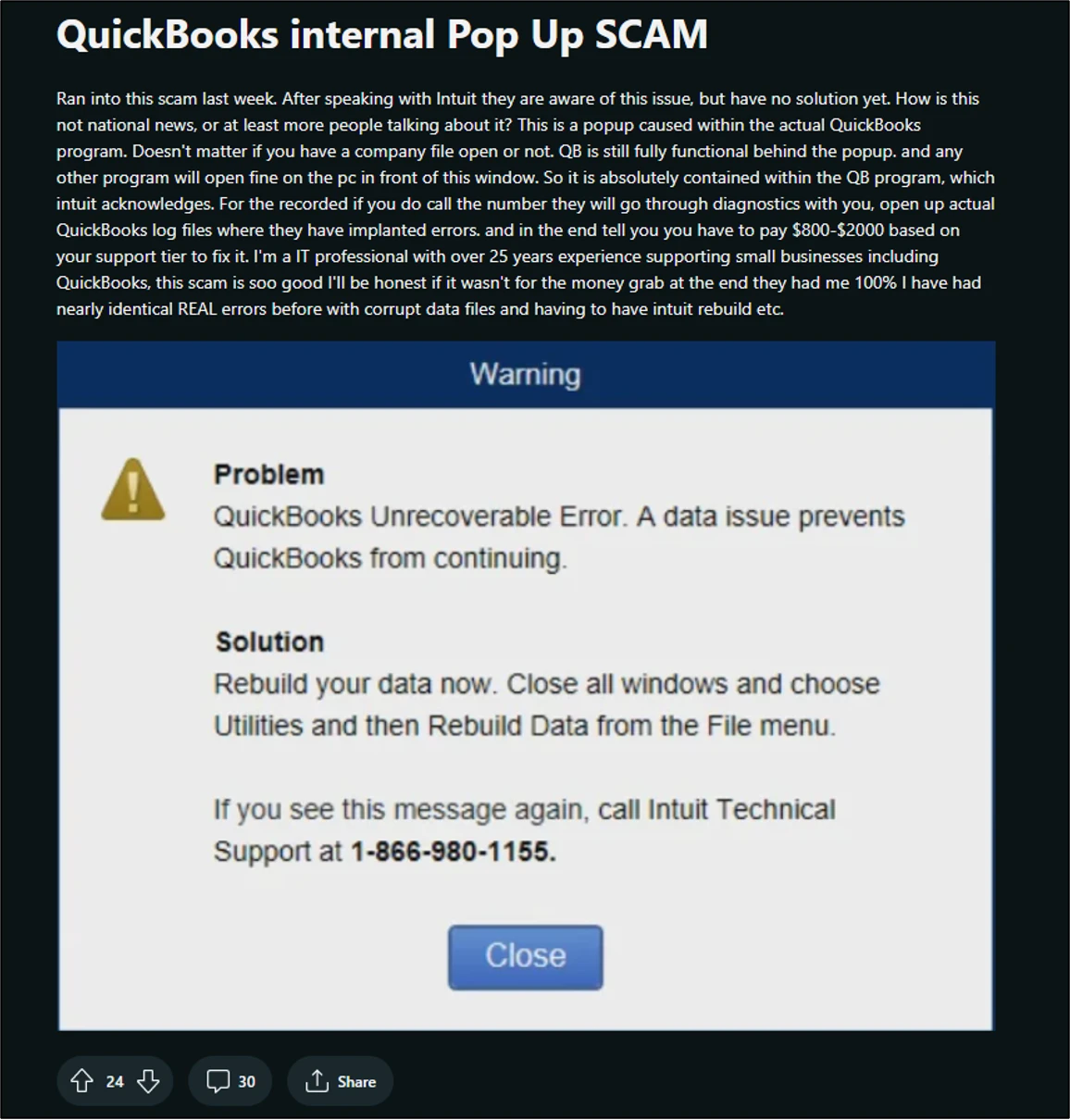 In addition, Researchers discovered that there had been reports on Reddit and QuickBooks forums about users being scammed with similar warning messages and illegitimate support services, priced around $800 to $2000.