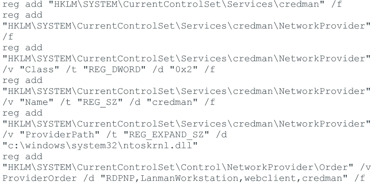 Threat actor installs the DLL module via credman Network Provider, using C:\Windows\Temp\install.bat script with reg.exe.