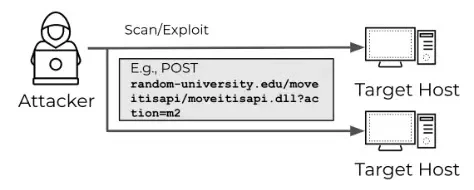 In the example, the attacker scans random-university.edu using an HTTP POST request to identify the MOVEit vulnerability (CVE-2023-34362), which can lead to a compromise if successful.