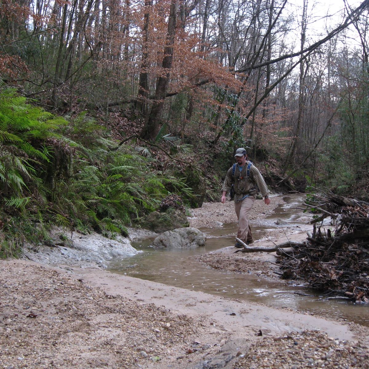 Cross the Forest Service road and turn left, heading south. Bug Branch flows beneath a bridge to the northwest.