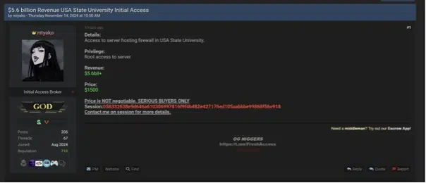 - U.S. University: The group offered root access to a university’s server for $1,500 on dark web forums, risking exposure of student records and financial systems.