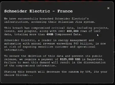 The group demanded $125,000 in Monero cryptocurrency but mockingly referred to the ransom as “baguettes” due to Schneider Electric’s French origins.