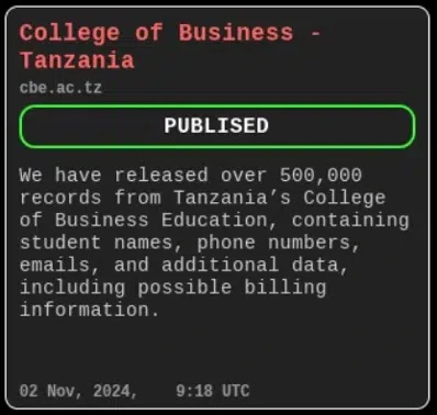 - Tanzania’s College of Business Education: In November 2024, Hellcat leaked over 500,000 records containing personal and billing information of students and staff.