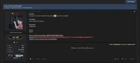 - Iraq City Government: Root access to municipal servers was advertised for $300, highlighting the group’s intent to disrupt public services.