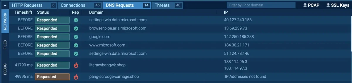 ”Network Indicators” are equally vital, as the DNS Requests, found under “Network → DNS Requests,” that expose domains and the malware attempts to access, not only that even it often unveils C2 infrastructure as well.