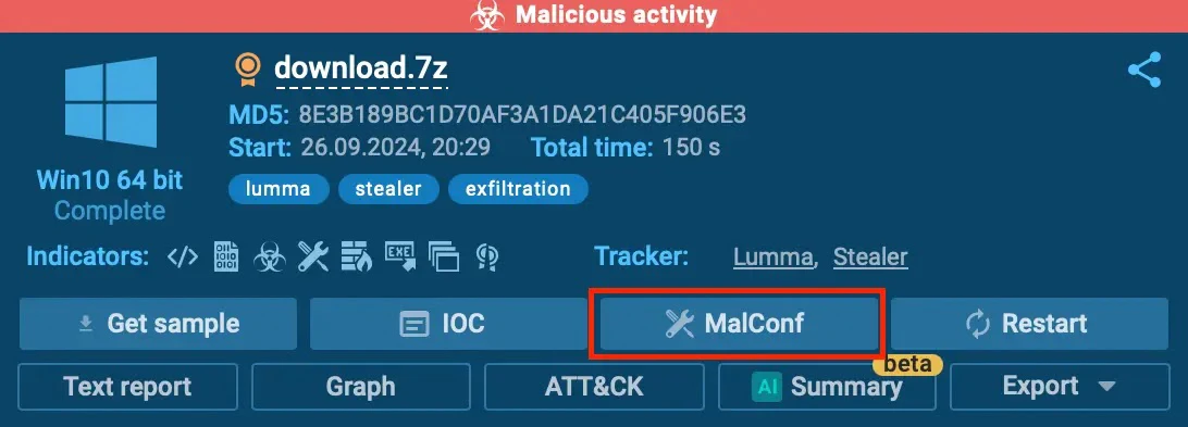 The platform’s sophisticated “MalConf” (Malware Configuration) feature is accessible via the top-right button.