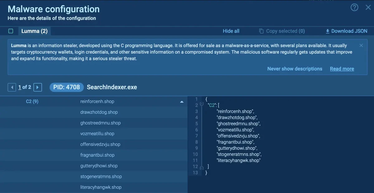 This automatically extracts crucial IOCs like “C2 server URLs,” “MD5/SHA file hashes,” “malicious domains,” and “IP addresses” from the malware’s internal configuration files.