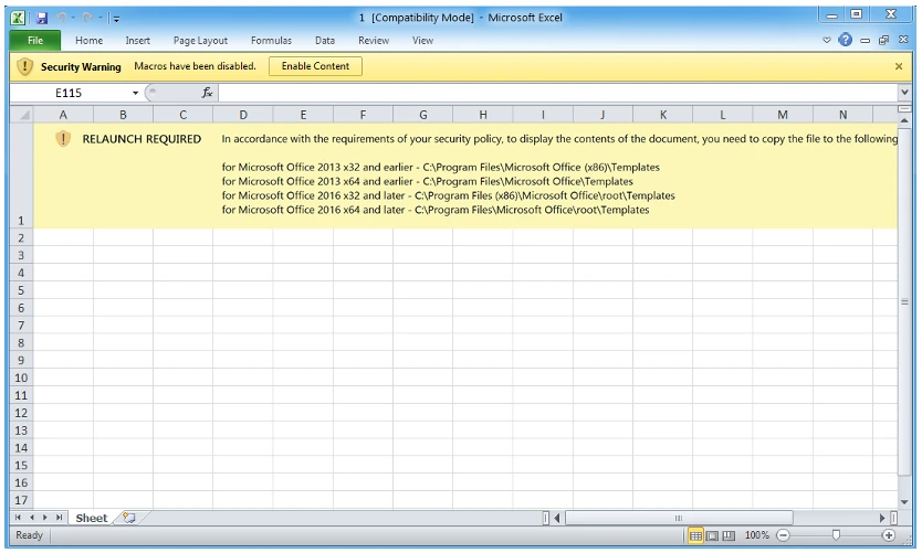 An interesting part is that the file contains instructions for victims to copy the file to a Microsoft Office Template location and run it from there.