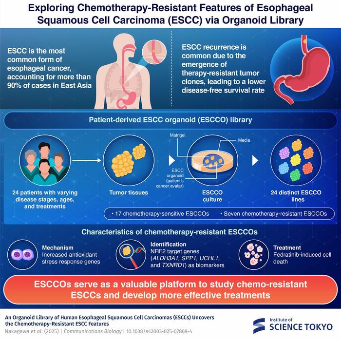 Esophageal squamous cell carcinoma (ESCC), a predominant form of esophageal cancer in East Asia and Japan, continues to pose a formidable challenge in oncology due to its high lethality and frequent recurrence following treatment. Ranking seventh in incidence and sixth in cancer-related mortality worldwide, esophageal cancer’s aggressive nature is compounded by the persistent issue of chemotherapy resistance, which limits effective management and worsens patient outcomes. In an innovative leap forward, researchers at the newly established Institute of Science Tokyo have harnessed the cutting-edge organoid technology to develop a comprehensive library of patient-derived ESCC organoids. These three-dimensional cellular structures faithfully recapitulate the complex biology of individual tumors, providing unprecedented insight into the mechanisms underlying chemotherapy resistance.