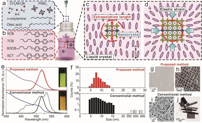 In response to these challenges, the POSTECH researchers developed a novel LARP synthesis method that employs a liquid crystal (LC) as an antisolvent. Liquid crystals are unique materials that exhibit properties of both conventional liquids and ordered solids, allowing them to maintain long-range molecular organization. The director or alignment of LC molecules contributes to an elastic response under external forces, a characteristic that the researchers strategically exploited to control PNC growth during synthesis. By simply substituting traditional antisolvents with LCs, the team maintained the previously established conditions while finding a way to reliably restrict particle growth.