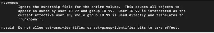 The first one is owners/noowners, which allows or prohibits support for user ownership. The other one is suid/nosuid, which turns on or off support for setuid and setgid bits.