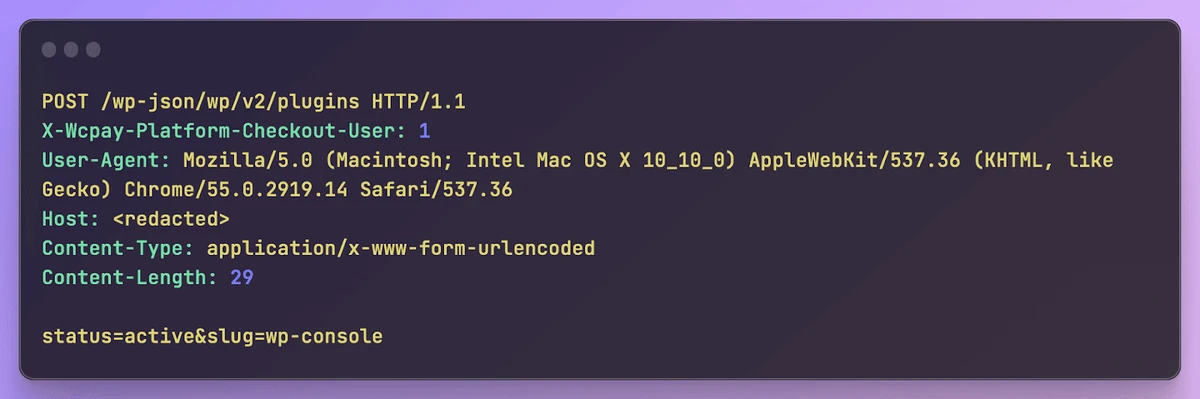 To execute code remotely on the vulnerable site, the threat actor installs the WP Console plugin by exploiting administrative privileges.