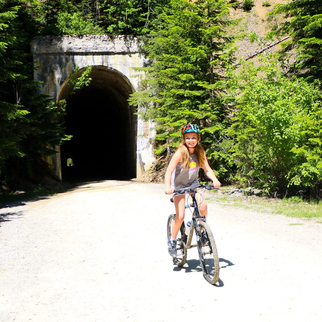 Spanning 15 miles, this mostly downhill route provides a thrilling yet accessible adventure suitable for just about anyone. Beginning at the East Portal Trailhead, the Hiawatha travels through dense forests and alpine meadows, across expansive canyons and clear mountain streams, past cascading waterfalls and beneath towering peaks. Along the way are 10 historic tunnels — including the iconic St. Paul Pass Taft Tunnel, stretching over 1.6 miles in length — and seven sky-high trestle-bridges with panoramic wilderness views. Captivating scenery unfolds with every twist and turn. Wildlife can be spotted along the route, especially in the early hours when there are fewer people on the trail. Keep an eye out for golden-mantled squirrels, a variety of birds, and the occasional deer, elk, moose, or bear. And at the end of the trail there’s a shuttle offering rides back up to the Roland Trailhead where you can bike back through the Taft Tunnel to your vehicle.