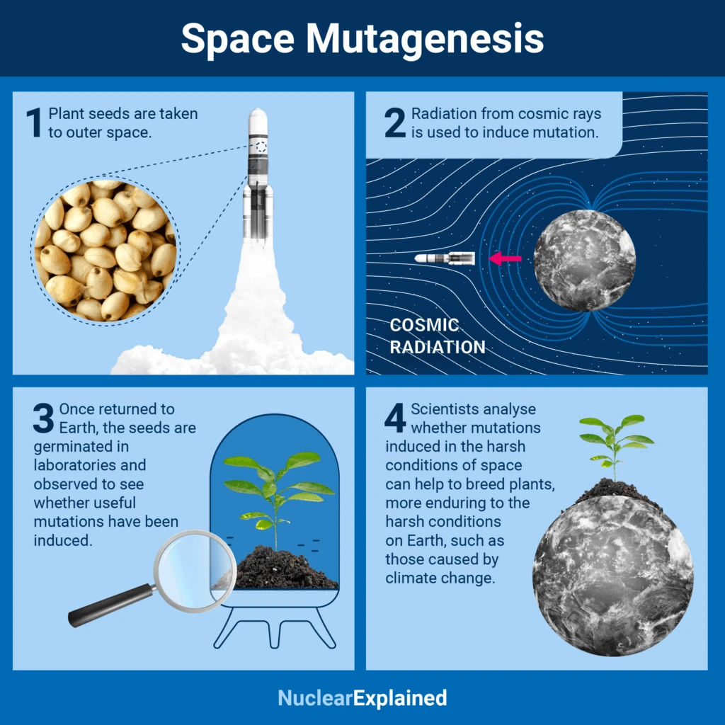 Space mutagenesis, is a method that involves the use of cosmic rays in outer space to induce spontaneous mutations. Scientists typically send plant seeds into space, and then grow, screen and breed them once they return to Earth. As in conventional mutation breeding, scientists try to identify the plants with the most useful traits, and those which may provide an advantage over more traditional crop varieties. Wheat, rice and cotton have already visited space.