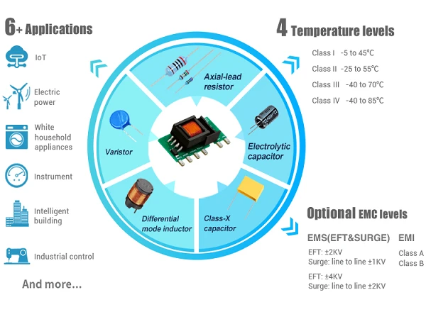 The LS-R3 series has achieved a wide input voltage range of 85-305VAC, which can meet the global universal voltage requirements; the static power consumption is as low as 0.1W, which meets the six-level energy efficiency and is suitable for many industries with high power consumption requirements; it can work with full load at -40℃ ultra-low temperature environment, and 50% load at +85℃ high temperature. And it can be compatible with below various application.