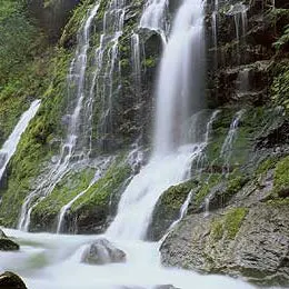 Turn south from the falls, following Swift Creek’s gorge. Continue south (straight) at the junction at mile 0.25. Now in the Marble Mountain Sno-Park, on trail 244, your return route is down gentle, wooded ski slopes, passing through several small meadows. At the next junction, take the left fork, staying on trail 244 for another 0.9 mile, passing the bottom connector of 244C. Next, turn east (left) on trail 244A. Cross a quarry area, veer right, and take the gravel road down to Road 83.