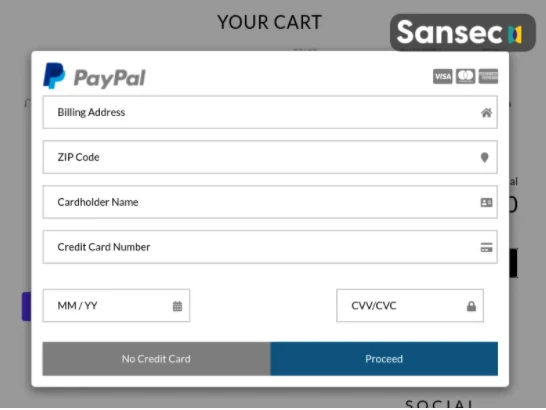 Once the customers have provided their credit card details, the skimmer will throw an error message saying “Paypal Checkout failed processing your order. You will be redirected to Shopify Checkout” and the customer is redirected to the real payment page: