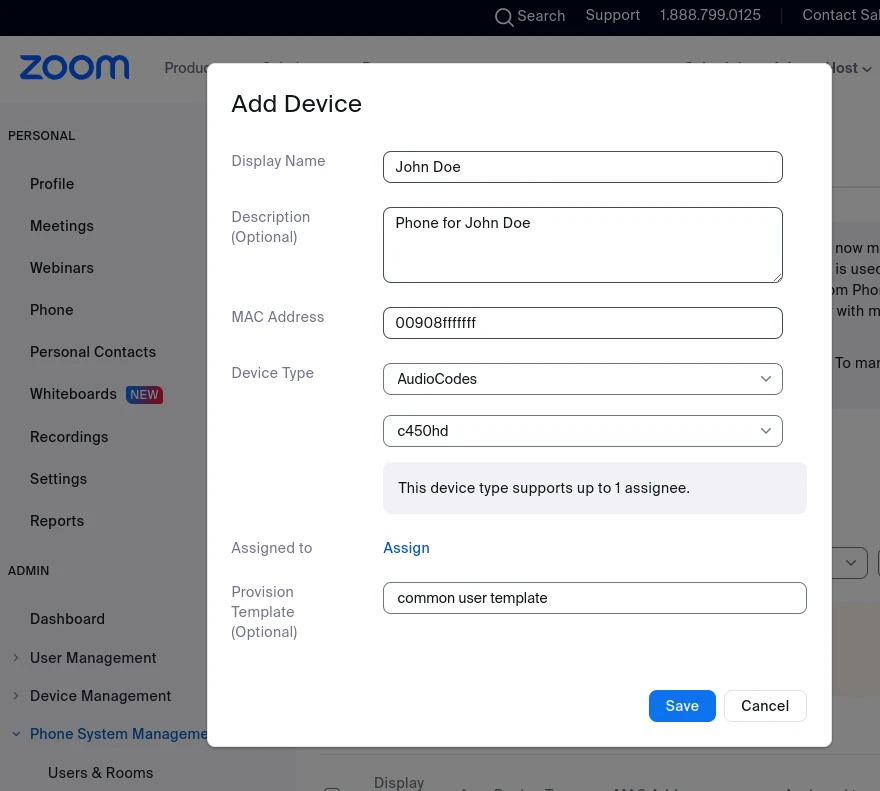Assigning a device is done through Zoom Phone’s administrative panel by adding MAC addresses. This means that a threat actor with necessary licences for using Zoom Phone can access arbitrary MAC addresses and put them in a self-defined configuration template.