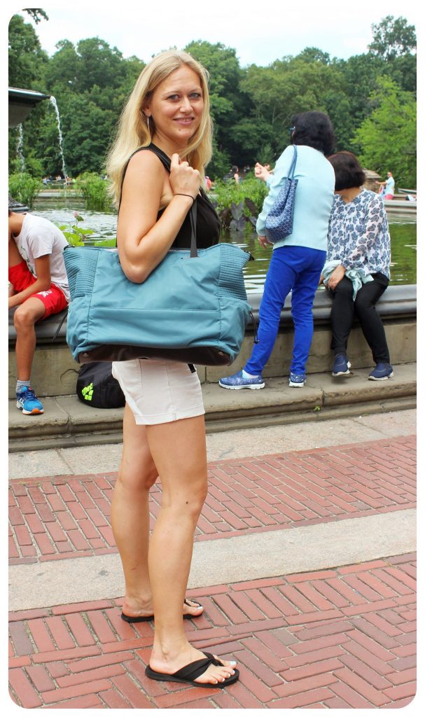 This is a great bag for a one or two-day trip – I’ve been using it so frequently since getting it earlier this year that I’m asking myself how I used to travel without it before that! The bag is big enough to fit a change of clothes and shoes, toiletries, and other travel essentials, but what I love the most is the interior laptop compartment, since I always travel with my laptop. There is also a small card slot inside the bag to protect passports and credit cards from RFID signals, and a zipper compartment on the outside for things you want easy access to, without having to open up the main compartment. I love that the bag has short straps as well as a shoulder strap, because that way I can use the bag while cycling and have been able to bike to friends’ houses and spend the night there.