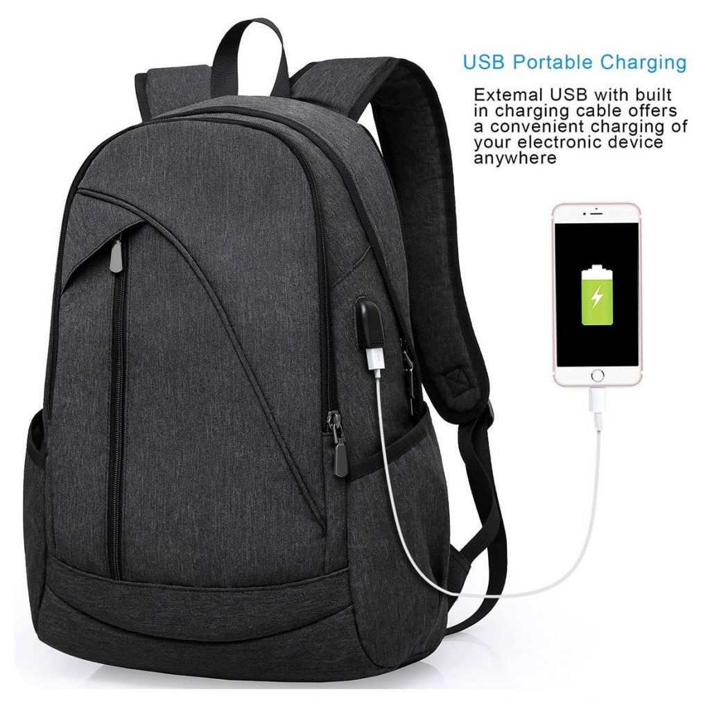 This anti-theft backpack by ibagbar is not only one of the best looking backpacks out there, but it is also one of the most affordable ones for the features it has: a USB charging port with built-in charging cable, a compartment for a 15.6-inch laptop, multiple other compartments and a reinforced zipper pocket. Additionally, it’s water resistant and lightweight – perfect for traveling.