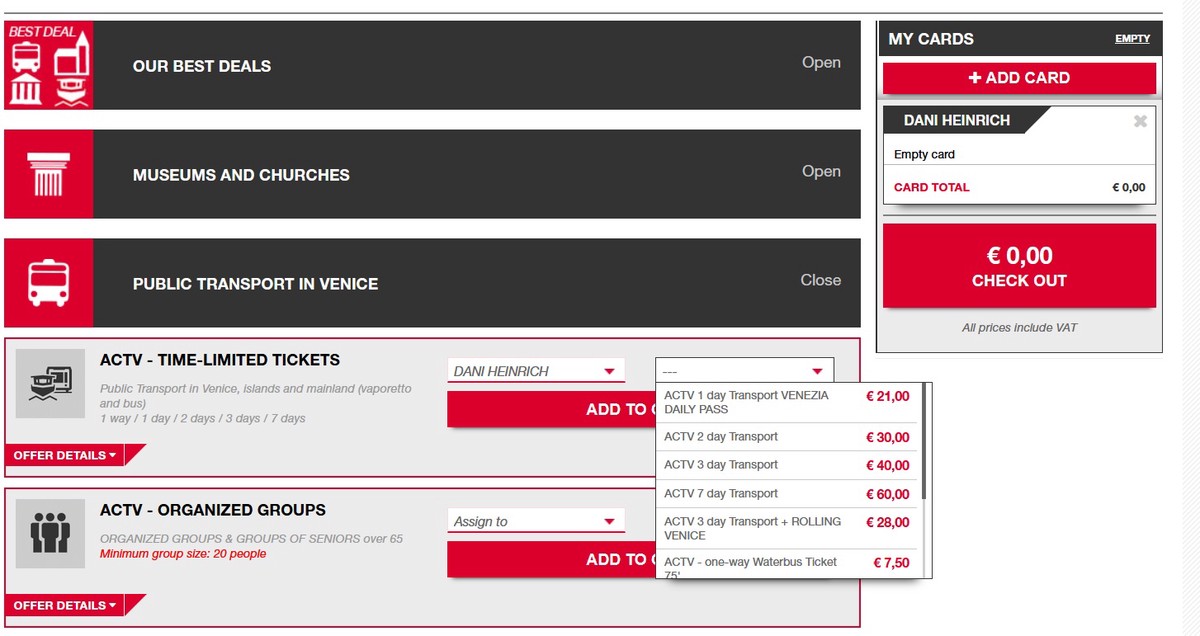 To buy a Venezia Unica card, you click the +Add Card on the right hand side of the website, put in your name, and then you’ll be able to add the travel card of your choice.