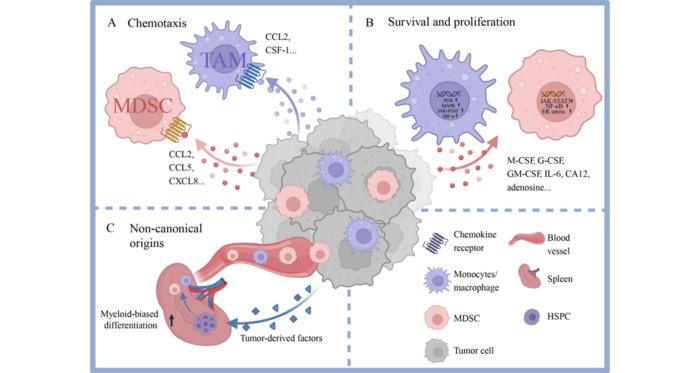 TAMs and MDSCs derive primarily from circulating monocytes and bone marrow progenitors, yet recent evidence highlights the contribution of extramedullary hematopoiesis, especially from splenic hematopoietic stem and progenitor cells (HSPCs), to the continuous replenishment of these populations within tumors. This systemic mobilization is driven by tumor-secreted factors that induce emergency myelopoiesis, skewing progenitor differentiation toward immunosuppressive myeloid phenotypes. Once recruited, these cells colonize the tumor stroma, where chemokines such as CCL2, CXCL8, and colony-stimulating factor 1 (CSF-1) orchestrate their accumulation, survival, and proliferation through engagement of receptors like CCR2, CXCR2, and CSF-1R.