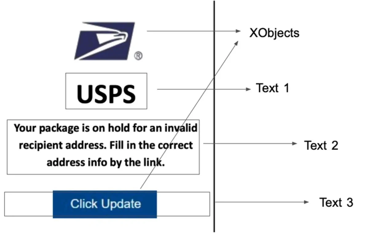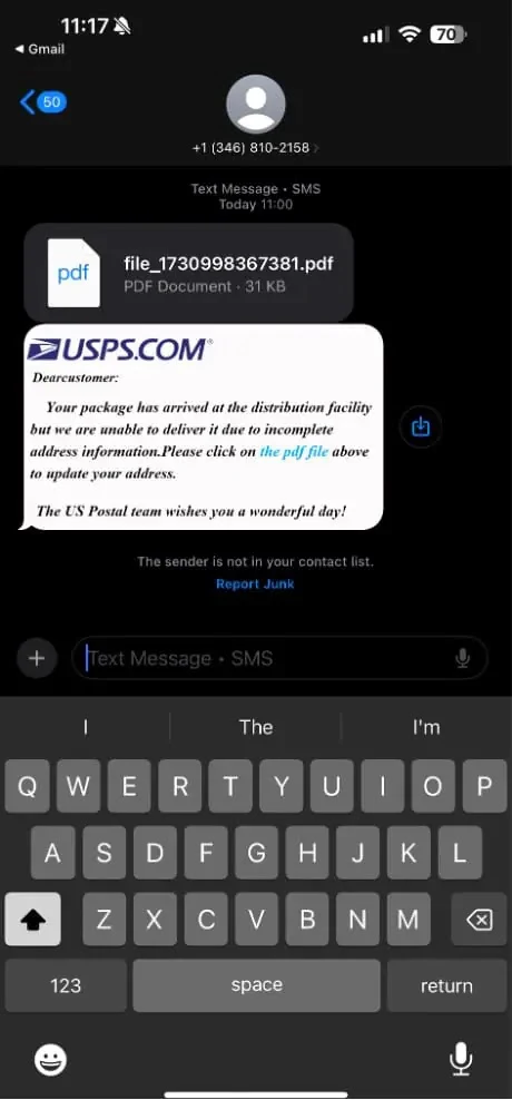 The campaign begins with SMS messages claiming undelivered USPS packages and includes an attached PDF file. The PDFs appear legitimate but contain hidden clickable elements that redirect users to phishing websites.