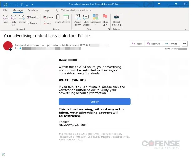 A phishing campaign targets business accounts associated with Meta (Facebook), and the attack uses various email subjects (e.g., policy violations and account deletion) to entice recipients into clicking.