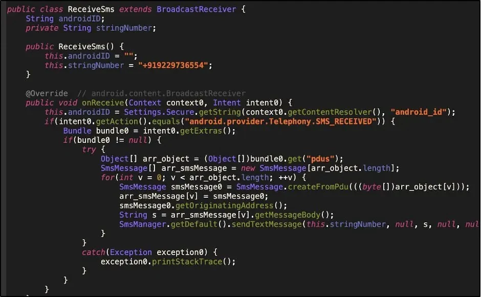 A key component of the malware is its ability to intercept SMS messages. Here’s an example of how it captures and forwards SMS messages:-