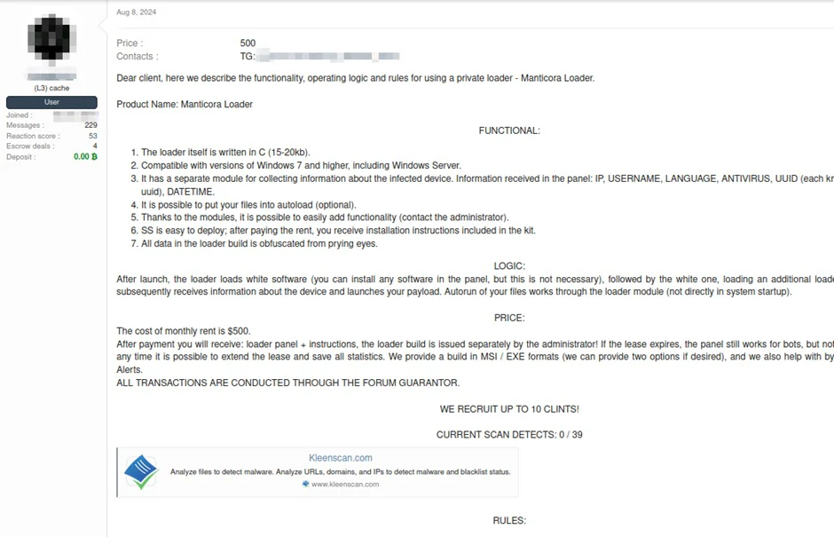 Advertised on underground forums and Telegram since August 8th, 2024, ManticoraLoader is a C-based tool designed to target Windows systems (including servers) and steal information like IP addresses, usernames, and installed antivirus software.