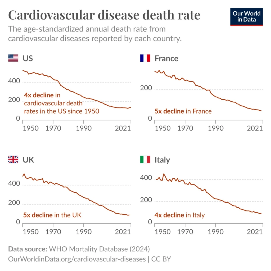 Instead, modern pesticides and modern medicine and improved health care have caused revolutionary declines in things that previous generations correlated to everything – cardiovascular disease.