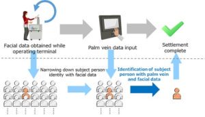 Palm vein authentication is now commonly used around the world to manage room entry, and to access ATMs as well as individual’s PC and other devices. In cases in which several tens of thousands of users’ palm veins are registered, such as for ATMs, a card or other information is entered to narrow down the data set for efficient comparison matching. To expand the use of cashless payments at stores, handling a one million-user scale volume requires authentication to take place in a clean, non-contact environment which is also user-friendly.