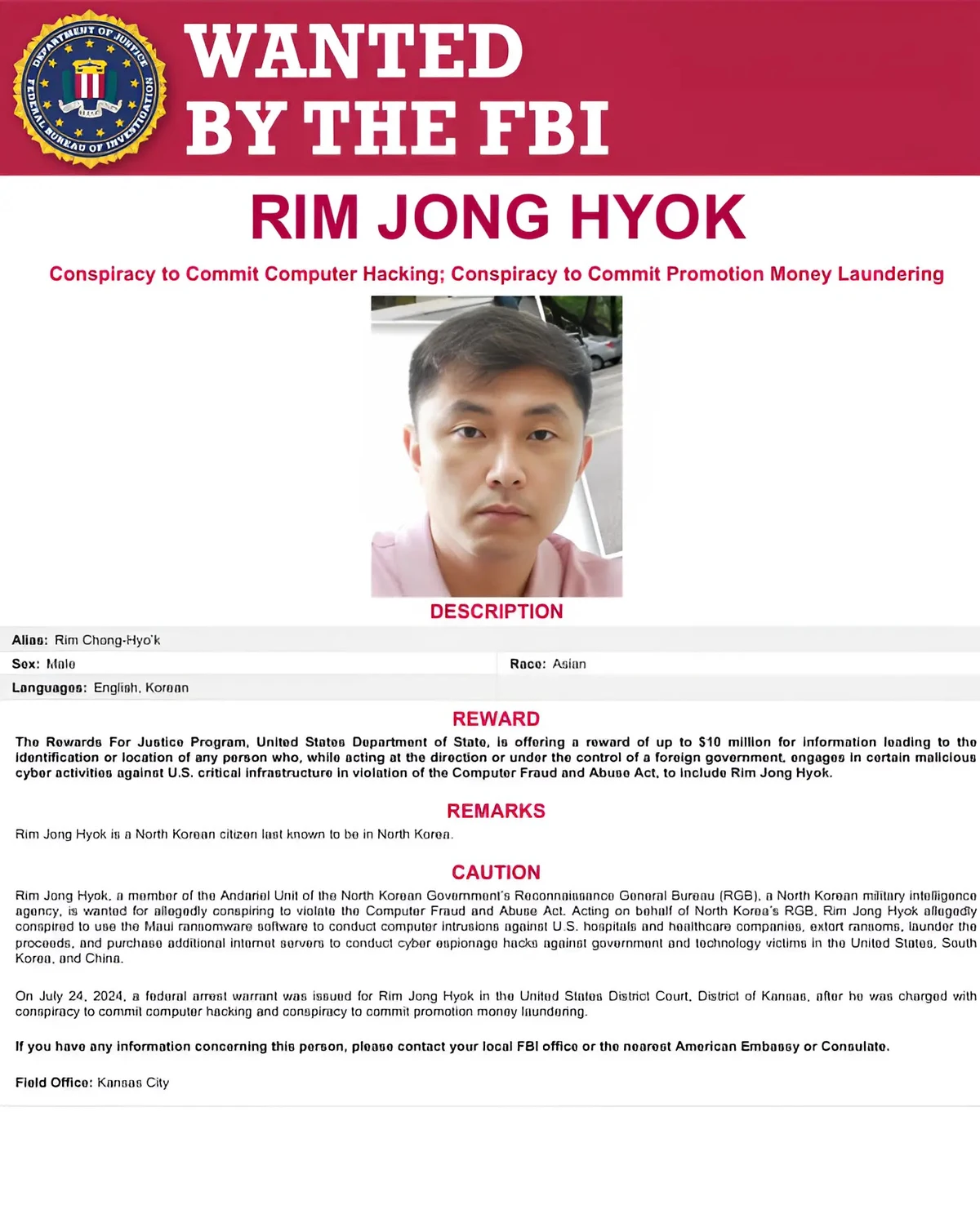 Rim Jong Hyok, a member of the Andariel Unit within North Korea’s Reconnaissance General Bureau, faces charges of conspiracy to commit computer hacking and money laundering.
