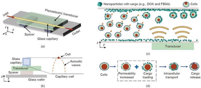 The acoustofluidics-based method described in this recent study exploits the interaction between standing acoustic waves and cargo-encapsulated nanoparticles within a glass capillary. When cells pass through the capillary, these acoustic waves act to push them toward the capillary wall, fostering a highly controllable environment for interaction between the cells and the encapsulated nanoparticles. This interaction is pivotal as it significantly increases the likelihood of nanoparticle attachment to the cell membrane, leading to enhanced uptake by the cells.