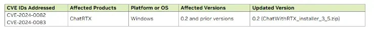 There is a security update for NVIDIA ChatRTX software for Windows that addresses vulnerabilities (CVE-2024-0082, CVE-2024-0083) in all versions prior to 0.2.