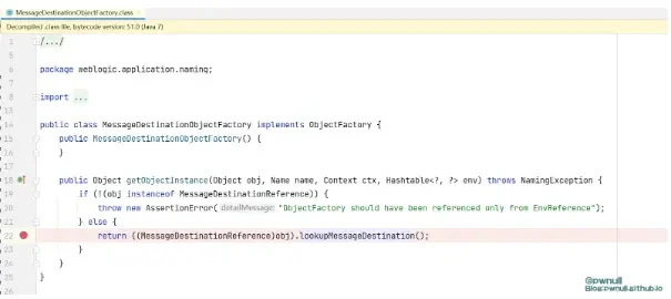The factory implements the `getObjectInstance` method of `MessageDestinationObjectFactory` achieving secondary JNDI injection in WebLogic, allowing to indirectly control resource binding and potentially circumvent restrictions.